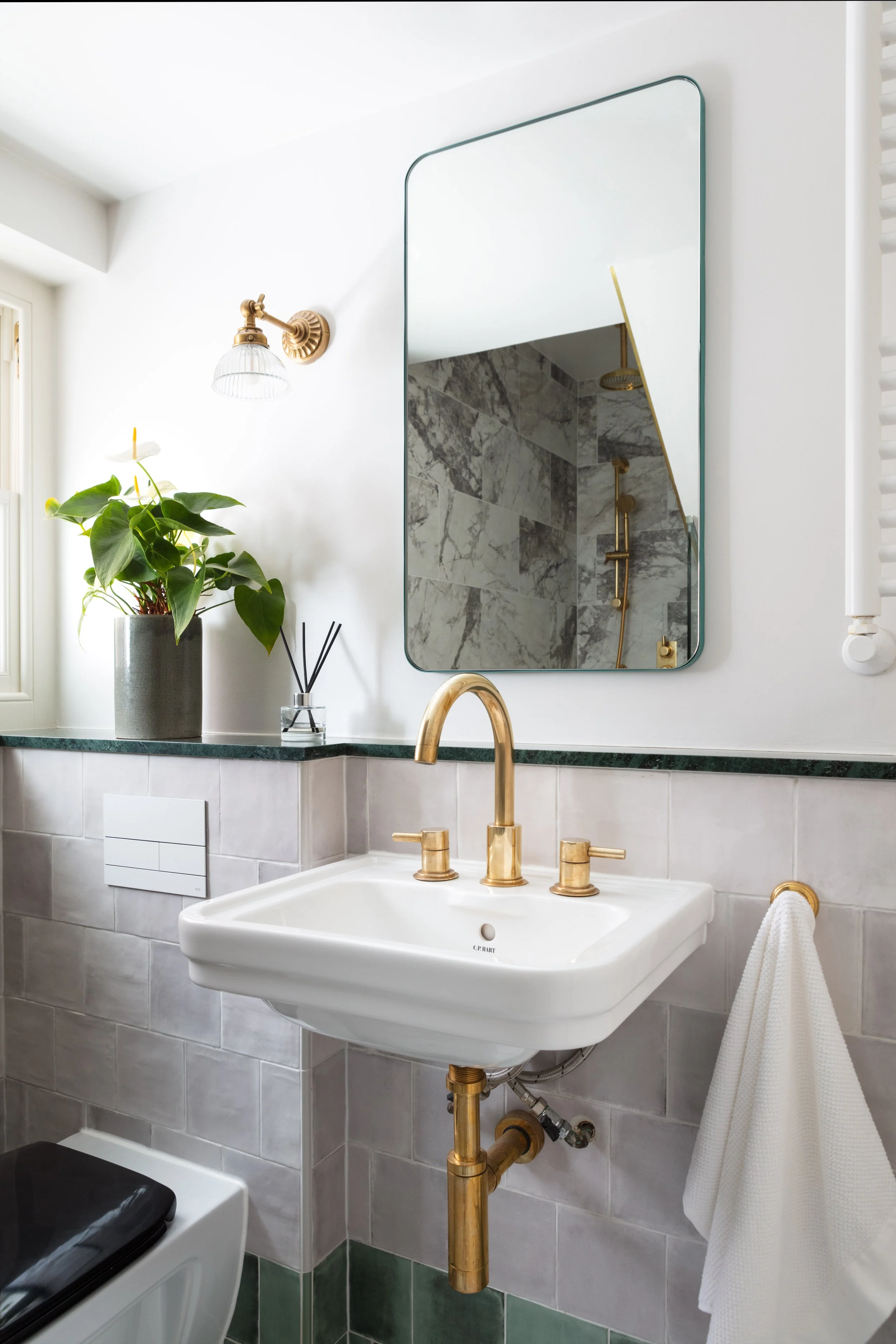Bespoke cabinetry was commissioned for the new kitchen, bedroom and a home office nook, using Corston hardware in unlaquered brass to link the designs. New lighting throughout from design focused UK brands was chosen to capture an Art Deco feel associated with the building’s architecture.