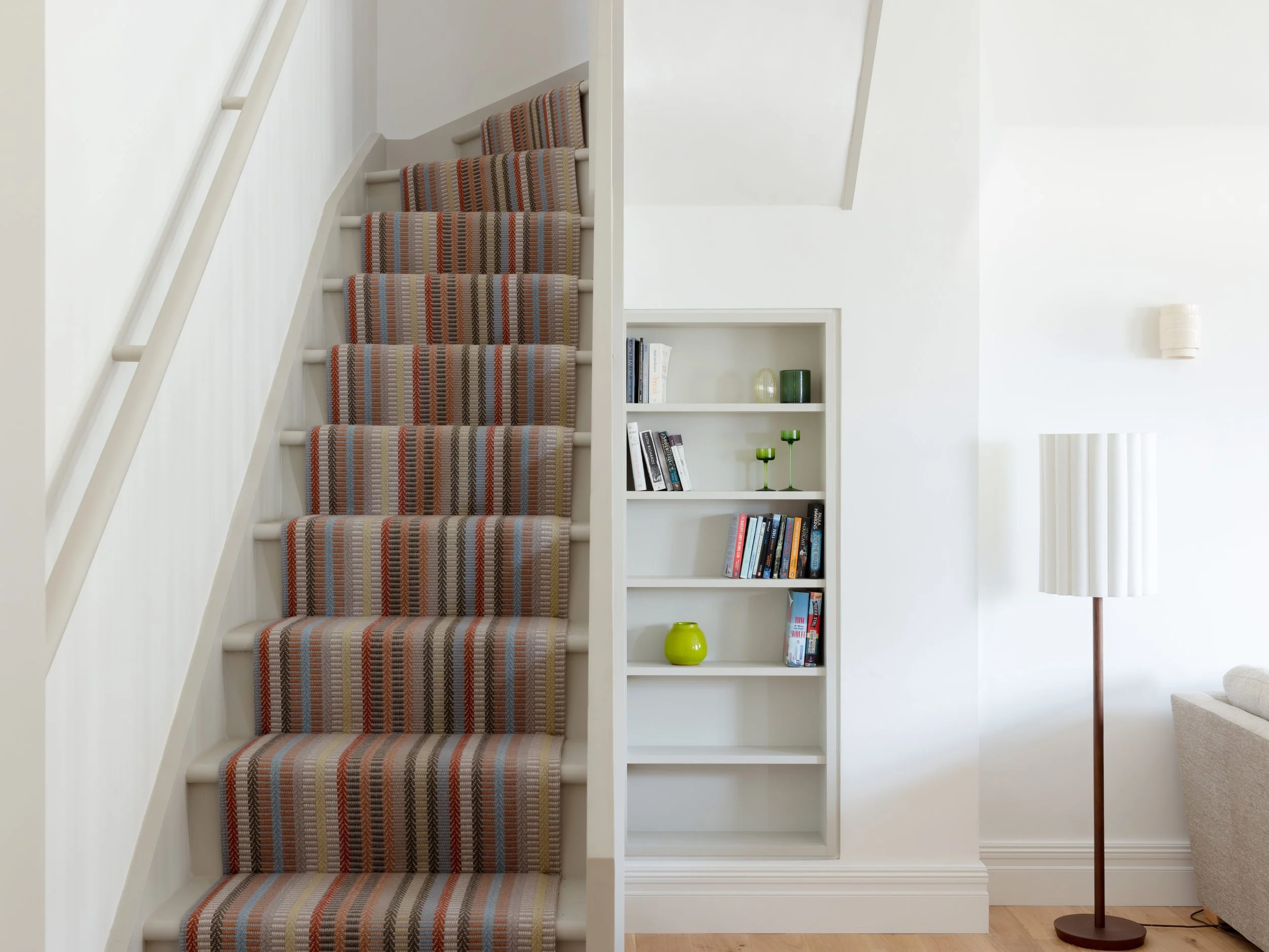 The existing poorly constructed staircase was replaced to have an open stair rail and built in designed by Seb and Fin Architects, manufactured and installed by K&D Joinery, fitted with a stair runner in a striking pattern.